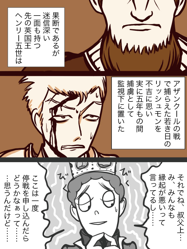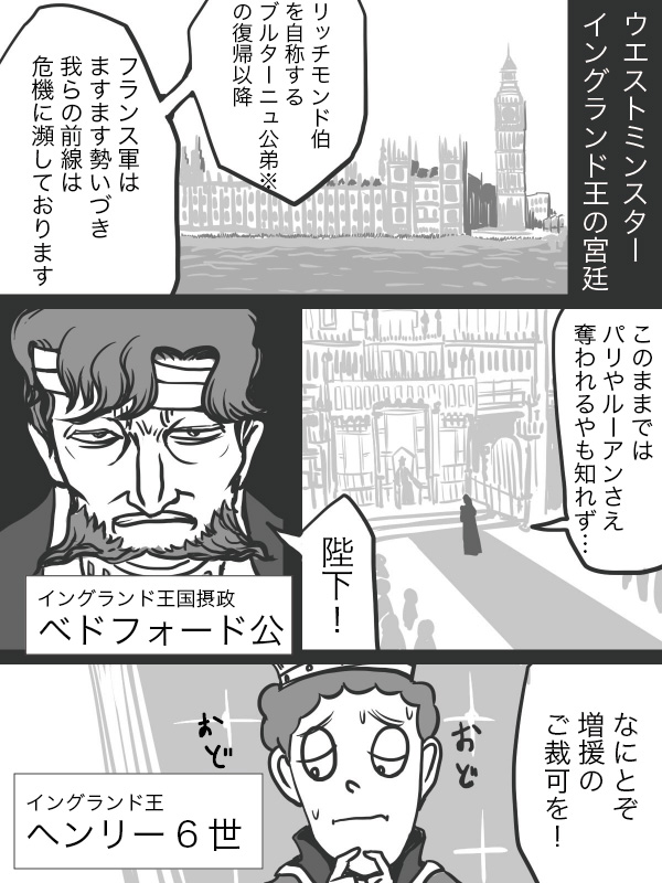 ※リッシュモンのこと。 リッシュモンとはそもそもイングランド領リッチモンドのフランス語読みである。アルチュールのリッチモンド伯位はブルターニュ公家の子弟の間で自称される名目上の爵位で、正式なものではない。ちなみに正統のリッチモンド伯位はこのベドフォード公が所有している。